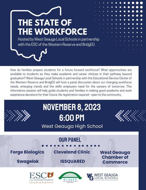 Please join us on November 8 for the State of the Workforce panel discussion. This event is open to parents and students interested in learning more about the current workforce.