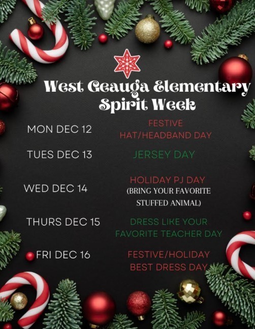 To celebrate the end of the quarter and final week before Winter Break, December 12-16 is SPIRIT WEEK at the Elementary schools! Each day will be festive and fun – and we especially cannot wait to see the outfits you choose on Thursday to dress like your teacher.